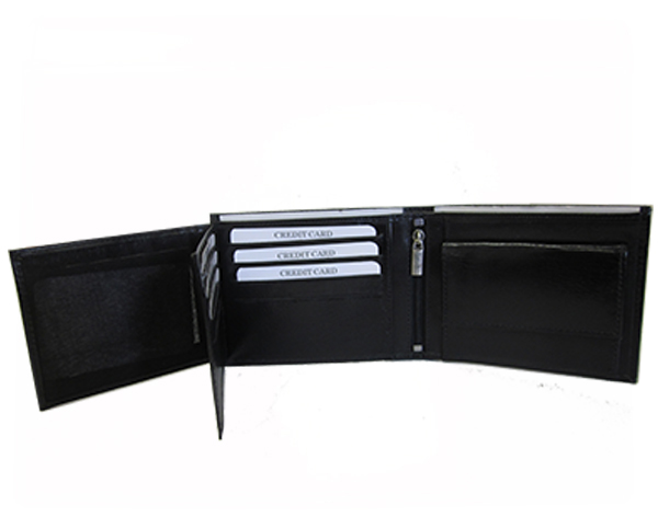 Truckers Tri Fold Wallet features coin compartment, double note compartment, 2 clear pockets and 8 card slots.